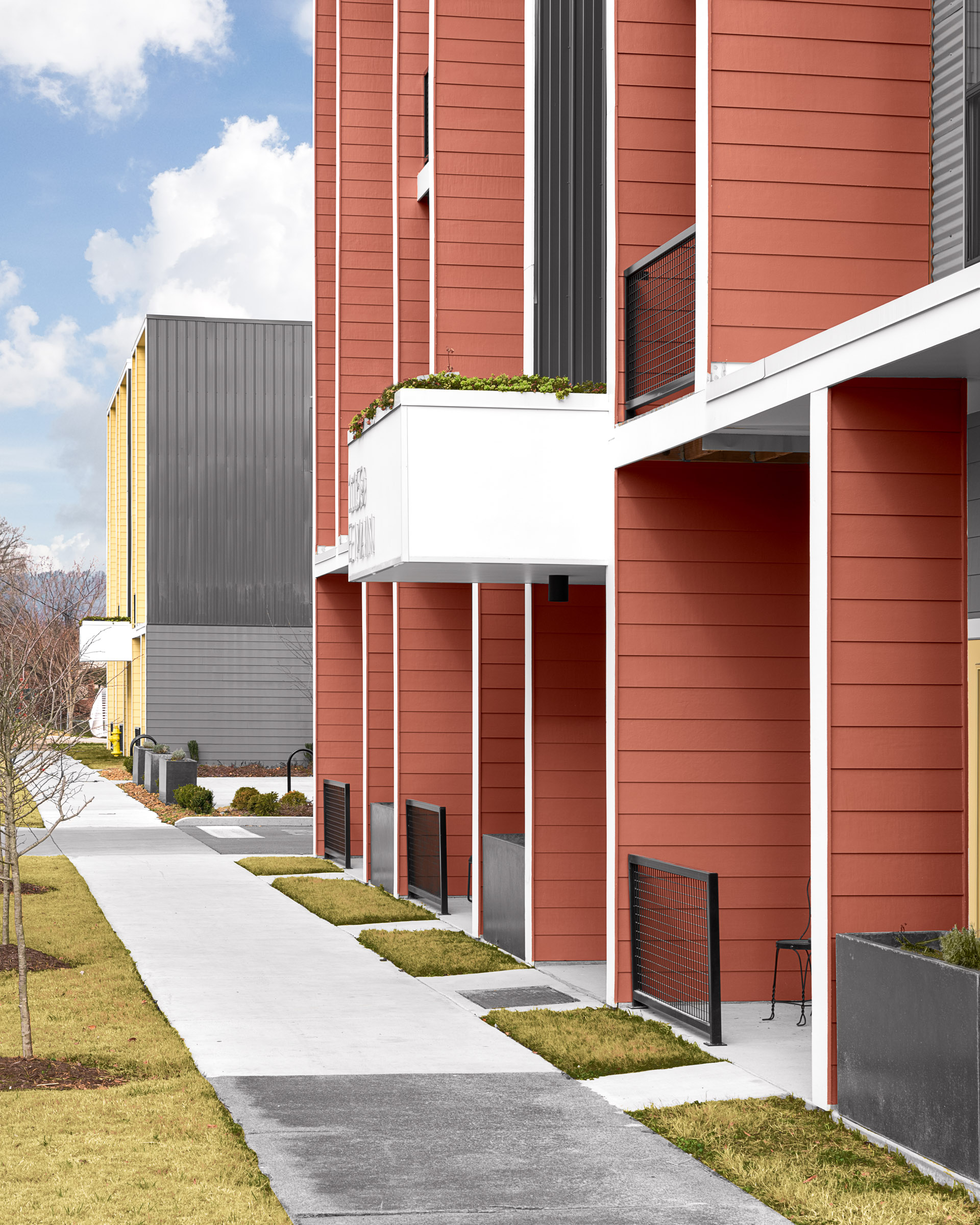 The site of a former tire store, Sculpture Flats consists of two 11-unit walk-up apartment buildings and a renovated commercial building in the Southside neighborhood of Chattanooga, Tennessee.